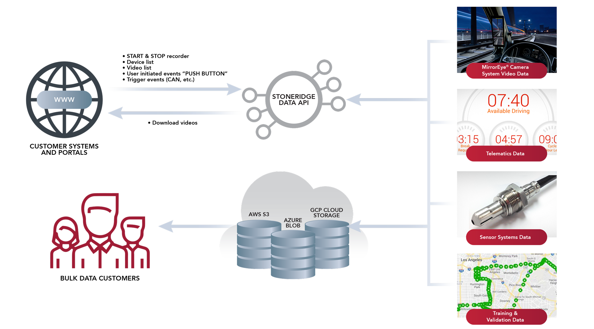 Discover available data sources. Start and stop data recording, manage recording triggers, download, delete, or archive videos. You are in total control of your data assets when you use Stoneridge data services.